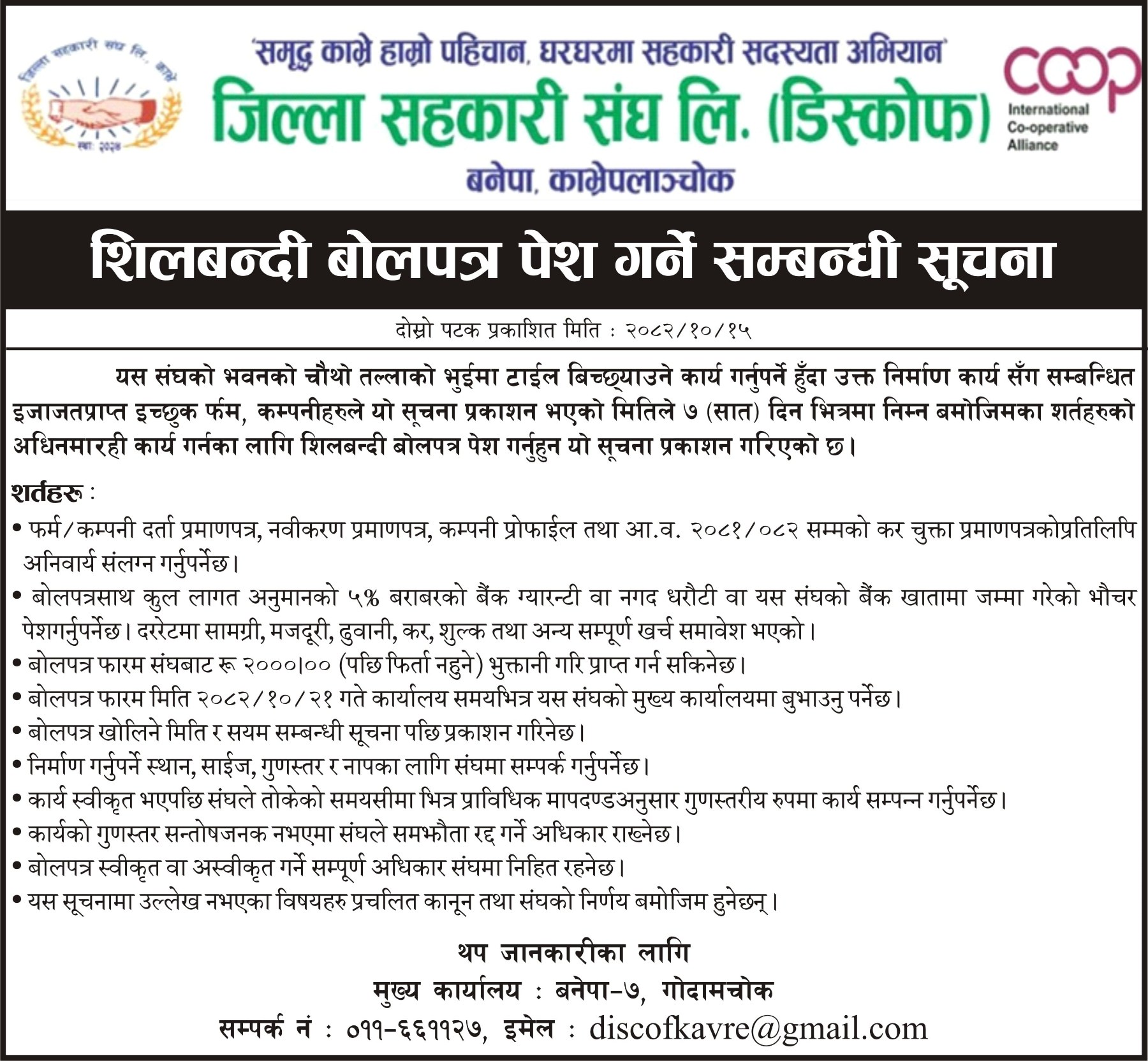 शिलबन्दी बोलपत्र पेश गर्ने सम्बन्धी सूचना । 2026-01-29 देखि 2026-02-05